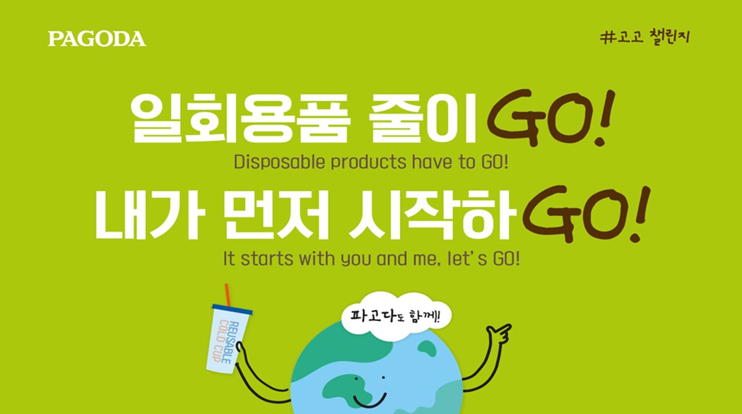 파고다는 ‘일회용품 줄이GO, 내가 먼저 시작하GO’라는 캠페인명으로, 사무실에서 일회용품 사용을 줄이고, 이 활동에 내가 먼저 시작하자는 뜻을 담아 슬로건을 완성했다. 이번 캠페인을 시작하면서, 사무실과 화장실에 친환경 제품으로 교체하였고, 임직원과 강사에게 슬로건이 담긴 리유저블 콜드컵을 선물할 예정이다. 리유저블 콜드컵에는 원어민 선생님들도 캠페인에 참여할 수 있도록 ‘Disposable products have to GO! It starts with you and me - let’s GO!’ 영문으로 제작했다.