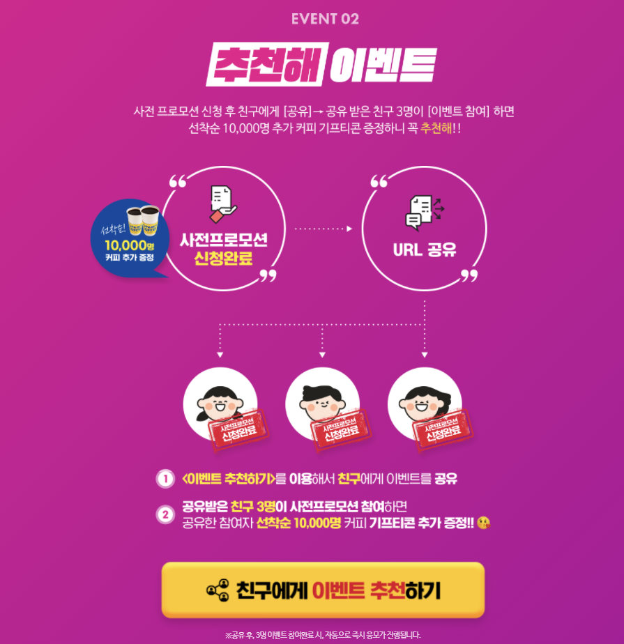 두 번째 추천해 이벤트는 URL 공유로 참여할 수 있다. 사전 프로모션 신청 후 친구에게 URL 공유하고, 공유받은 친구 3명이 이벤트 참여하면 선착순 10,000명에게 커피 쿠폰이 추가로 증정된다. 특히, 실시간 신청 현황을 홈페이지에서 확인할 수 있어 이벤트 참여하고도, 쿠폰을 받지 못하는 허탕을 방지했다.