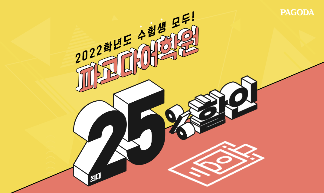 파고다 교육그룹의 파고다어학원이 2022년도 수능 수험생을 위해 3월 15일까지 수강료 최대 25% 할인 이벤트를 진행한다고 밝혔다. 수능 할인 이벤트는 학원으로 방문 시, 각 학원 데스크에 신분증과 22학년도 수험표를 제시하면 되고, 온라인으로 등록 시, 파고다 홈페이지에 로그인하고, 생년월일과 수험표 번호를 입력하면 할인 쿠폰을 받을 수 있다.