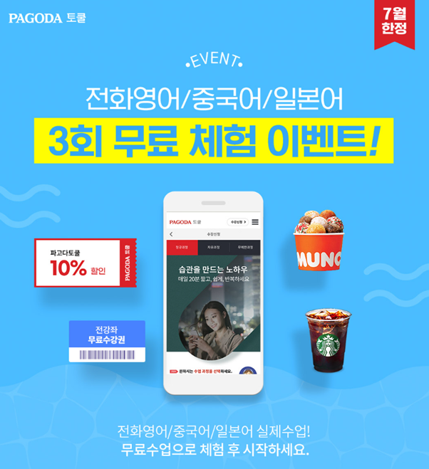 파고다 교육그룹의 전화&화상 외국어 ‘파고다토쿨’이 영어, 중국어, 일본어 3회 무료 체험 이벤트를 진행한다. 첫 번째 수업은 나의 실력을 확인하는 테스트이며, 2~3번째 무료 수업에서는 일반 수업과 같은 형식으로 진행한다. 3회 무료 체험 완강 시, 스타벅스 아메리카노 커피쿠폰을 제공하는 데 이어 수강 신청 시 던킨도너츠 먼치킨 10개입 쿠폰을 추가 선물한다.